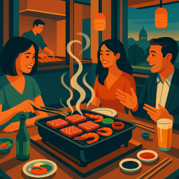 Let's say Peter has a great morning and decides to take his three friends to Gyubee Japanese Grill (Merivale) Ottawa at 6 PM the same day.