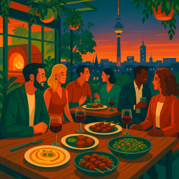 Authentic Israeli food with fresh ingredients+ the best view of Berlin! Surrounded by glass windows that overlooks the city, one can enjoy delicious food and drinks in the clouds. Highly recommend for dates , family and friends gatherings and just g