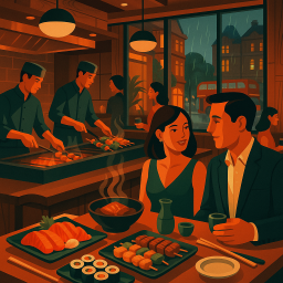 Let's say Peter has a great morning and decides to take his three friends to ROKA Mayfair London at 6 PM the same day.