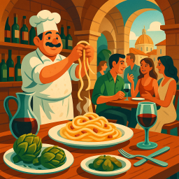 * Peter can now enjoy the dinner with his friends at Trattoria al Moro Roma!